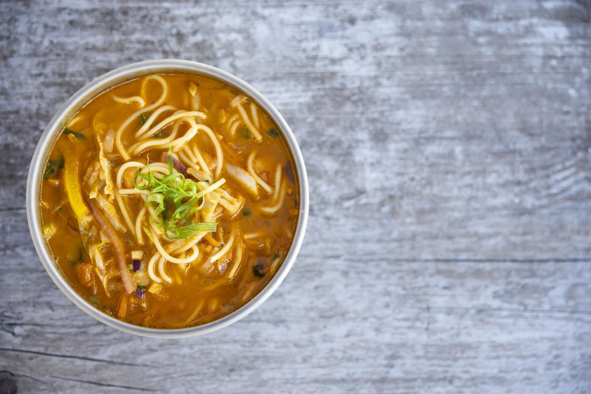 Alakítsuk ki az alapízt: serpenyőben vagy wokban hevítsük fel az olajat, adjuk hozzá a gyömbér-fokhagyma pasztát, és pirítsuk 15–20 másodpercig, amíg illatozni kezd. Szórjuk bele a szárított chilit, a kasmíri chiliport és a kurkumát, majd gyorsan keverjük el, hogy ne égjenek meg. Adjuk hozzá a csirkemellcsíkokat, pirítsuk 2–3 percig, amíg kifehéredik. Dobjuk rá a julienne-re vágott zöldségeket, és kevergetve pirítsuk további 1–2 percig. Öntsük fel az alaplével, majd ízesítsük szójaszósszal, rizsecettel, fehérborssal és sóval. Forraljuk fel, majd főzzük még 3–4 percig, hogy az ízek összeérjenek. A kukoricakeményítőt kevés vízzel keverjük ki, majd folyamatos kevergetés mellett csorgassuk a levesbe. Főzzük további 1 percig, amíg enyhén besűrűsödik. Tálaláskor a főtt tésztát helyezzük egy mély tál aljára, öntsük rá a forró levest a csirkével és a zöldségekkel. Tetejére szórjunk friss koriandert és egy kevés aprított újhagymát.