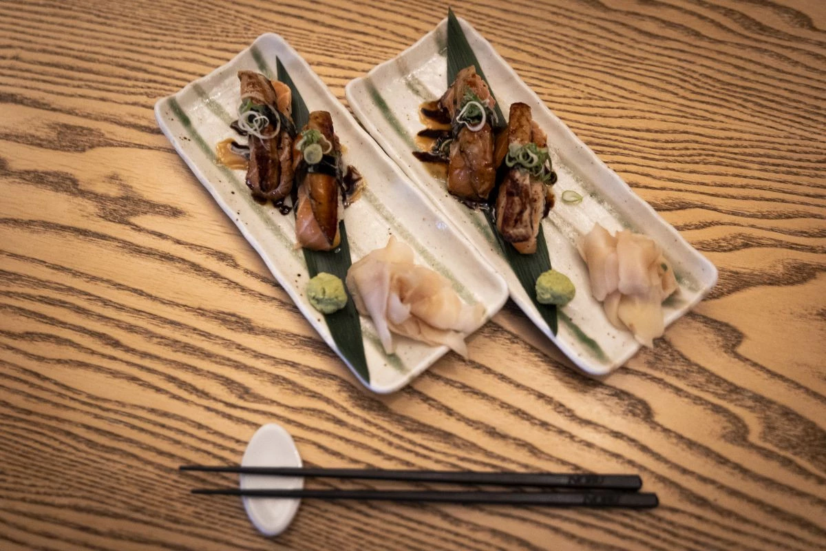 A kész sushi rizst (nagyszerű videók találhatók a YouTube- on, amelyeken Nobu san tanítja a formázást) megformázzuk. A lazacfilét konyhai perzselővel körbepirítjuk, szeleteljük. A kacsamájat sózzuk, borsozzuk, serpenyőben lágy kérget sütünk rá, felszeleteljük. A megformázott rizst wasabival vékonyan, lágyan megkenjük, ráhelyezzük előbb a lazac-, majd a kacsamájszeletet, ecsettel megkenjük a balzsamecet-redukcióval, és néhány nagyon vékony szelet zöldhagymával díszítjük.